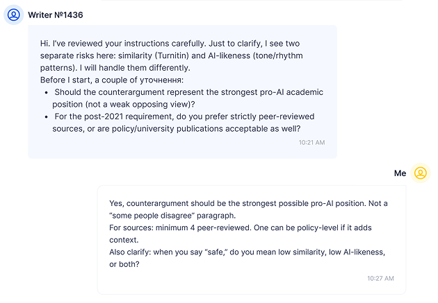 The order was configured to create risk conditions before any writing began. This matters because many services look “fine” once a draft exists-but they reveal automation habits in the first messages.