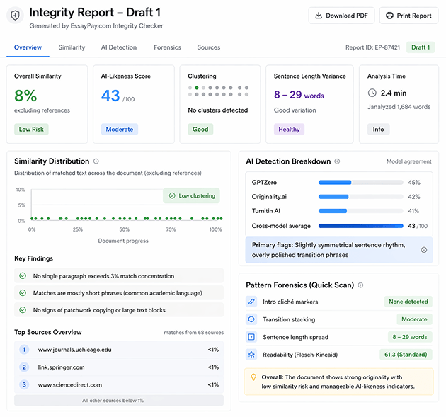 - Risk separation: explicit split between “similarity risk” and “AI suspicion risk.”
