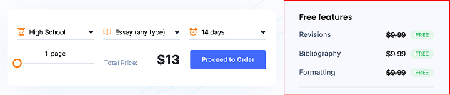 • Claimed Skillset: Title Page, Reference Page, Plagiarism Report, Revisions, Bibliography, Formatting-all bundled into the “Free Features” package (claimed savings of $55).